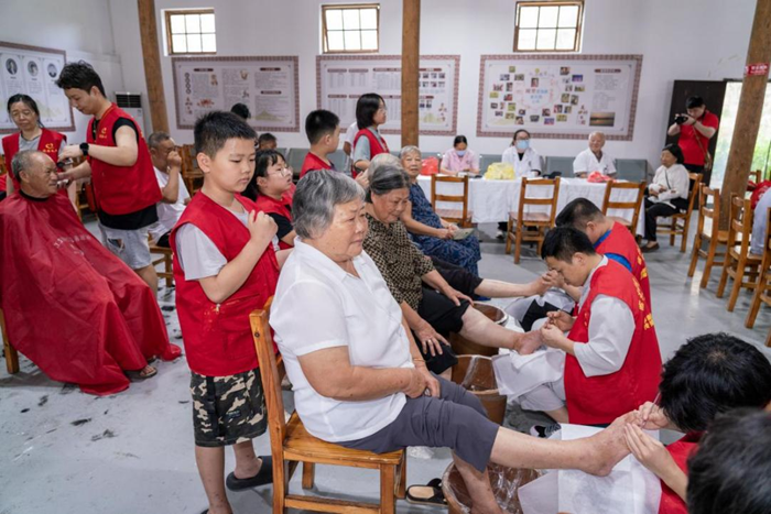 8月30日,在浙江省台州市临海市桃渚镇城里村,志愿者们正在开展新时代文明实践志愿服务集市日活动。新华网 钟奕 摄