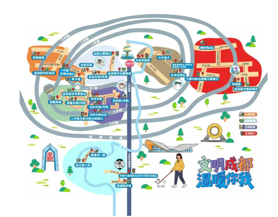 漫步成都大街小巷、市场院落,和谐温馨的生活场景和文明有序的城市氛围共同渲染美好生活的底色。成都市文明办联手相关部门发布“文明漫游指南”,精选首批7条文明漫游线路,包括华阳街道新时代文明实践所、益民菜市芳草街店、水井坊街区、支矶石街3号院、玉林四巷、九寨沟路与雅砻江路路口等,悉心串联文明街巷、文明院落、文明市场、文明路口等生活场景,为市民游客用脚步丈量文明成都提供了贴心指南。