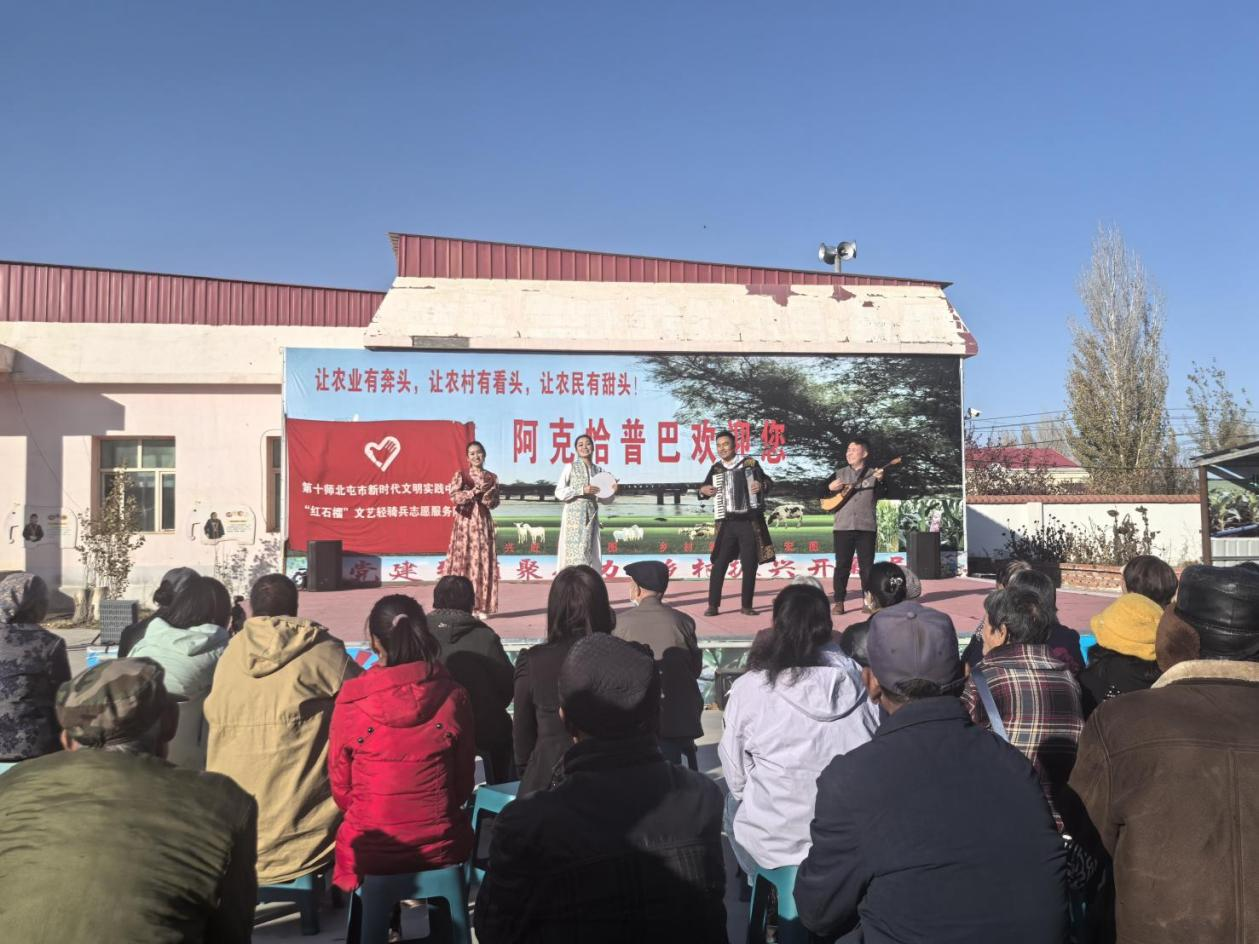 10月22日,“红石榴”文艺轻骑兵志愿服务队为阿勒泰市切尔克齐乡阿克恰普巴村村民们带来了一场精彩的演出。邓纯雪 摄
